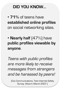 Teens are posting a tremendous amount of information on their online profiles, so it is vitally important that teens use strict privacy settings and are savvy about the individuals they allow to view their social networking profile. Since kids are often trying to catch the attention of and gain approval from their peers, some teens tend to post content to appear popular or to gain a response from others in their online community; teens jockey for status, post risqué pictures, brag about the previous weekend’s adventures, and can easily use this digital space to humiliate others or post inappropriate content.5 No information is truly private in the online world; an online “friend” can forward any information posted on your child’s site in a moment.